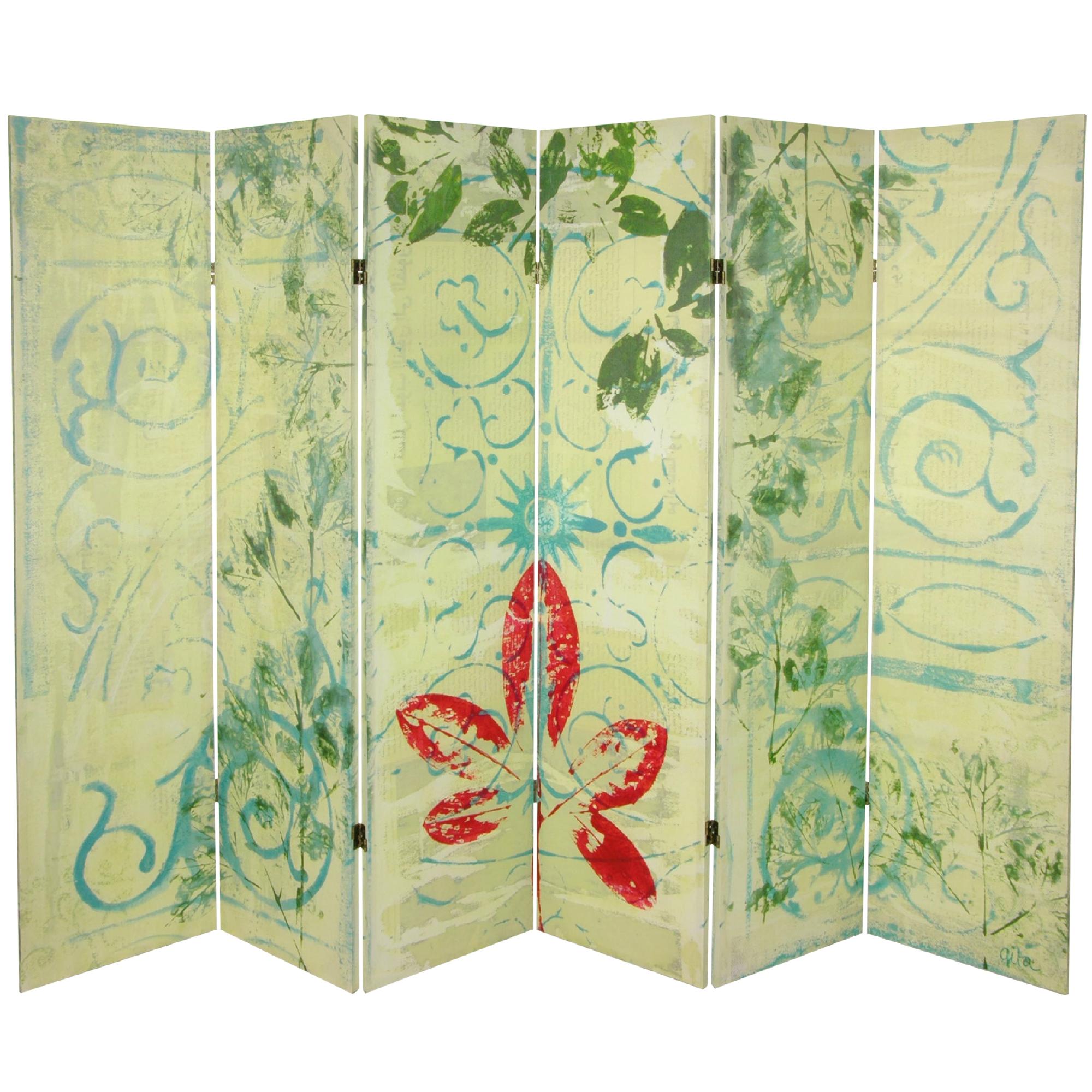 This is a screen made from the mixed media collages of the artist Gita. In Garden Gate, the mood is both quiet and centered, energetic and light-filled. Printed leaves provide a sunshine-flooded atmosphere structured with turquoise garden gate drawings and subliminal multi-cultural characters. The screen frame is crafted from light weight Spruce wood. Dimensions: 0.75"L x 94.50"W x 63.00"H